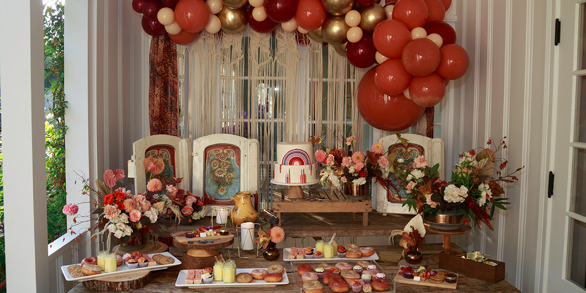 @ShawnaYamamoto) to create some beautiful floral moments and photo ops. In one of the vignettes, we mixed Tina’s wooden daybed with vintage leather chairs Jessica had in storage to create an outdoor “Grey Gardens” type overgrown seating spot. She also created a floral ring to take photos in front of, and added touches through out the event to beautifully clash the textures and pull the color palette together. They vibes perfectly with Tiffany’s balloons from Tamber Crafts (