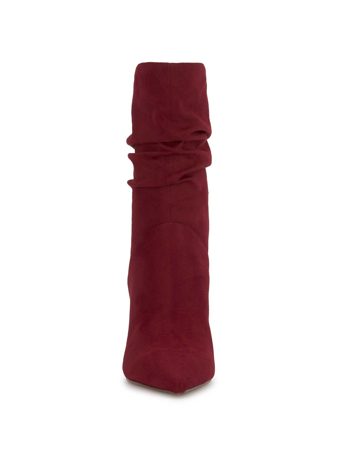 This is a sleek black mid-calf boot featuring a pointed toe and a slim high heel. It has a relaxed, slouchy shaft for an effortlessly chic silhouette, making it versatile for both casual and dressy outfits.