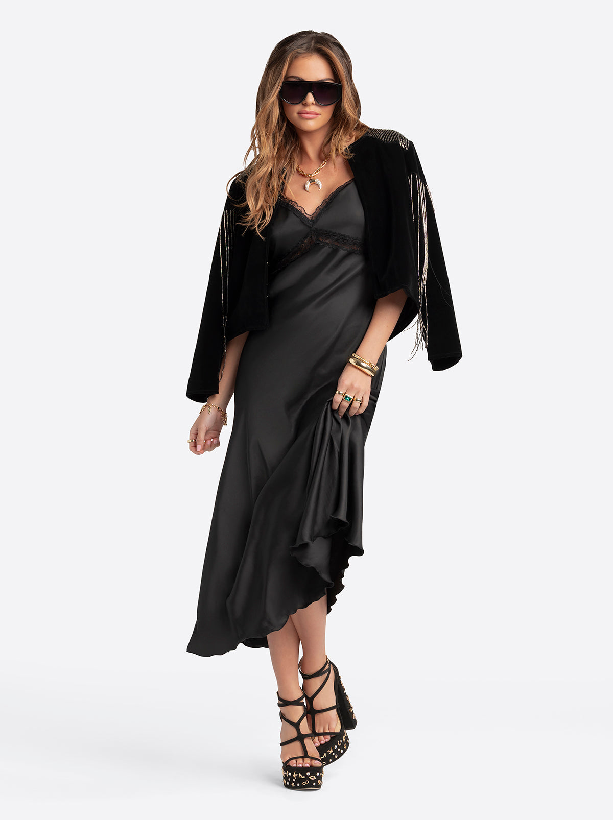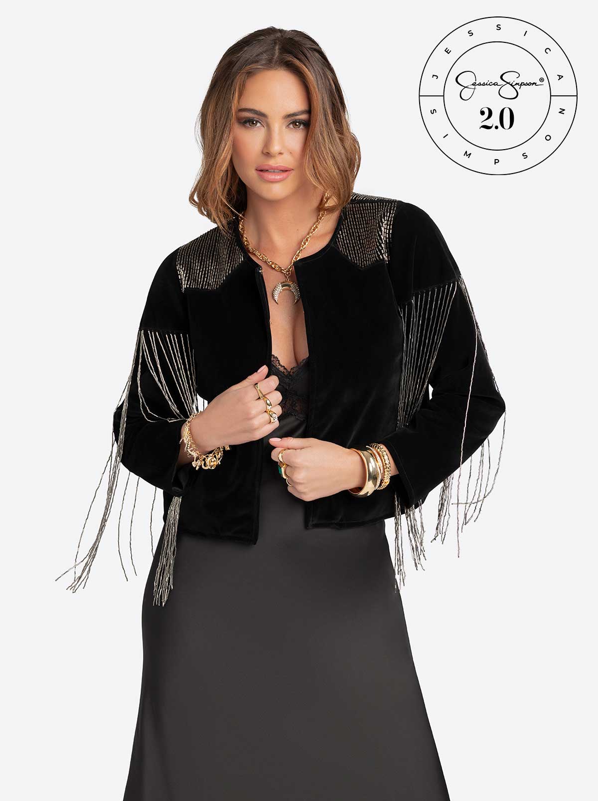 Turn every entrance into a show-stopper. This sleek crepe jacket is all about drama, with long, flowing beaded fringe sleeves that move with you—hello, instant spotlight. Sharp lines keep it polished, while the swaying beaded fringe adds that playful, dance-all-night energy. Perfect for anyone who loves their style with a little extra wow.