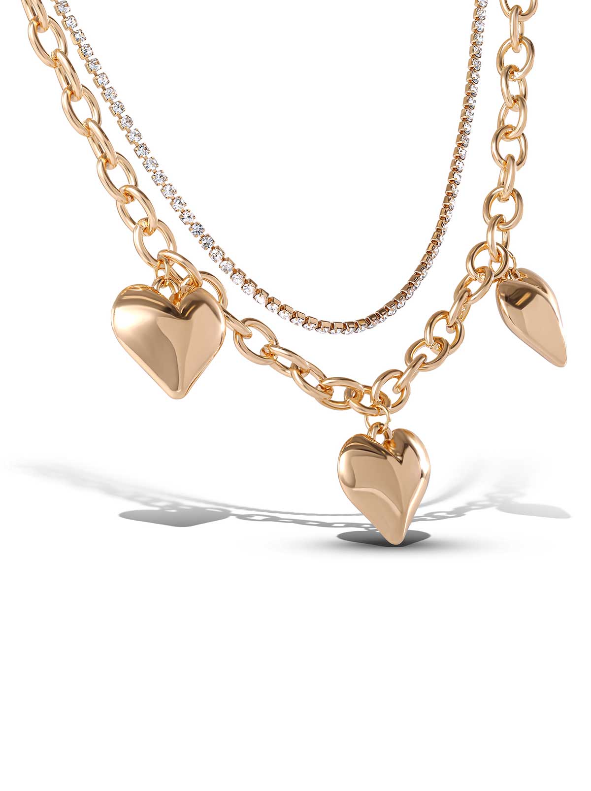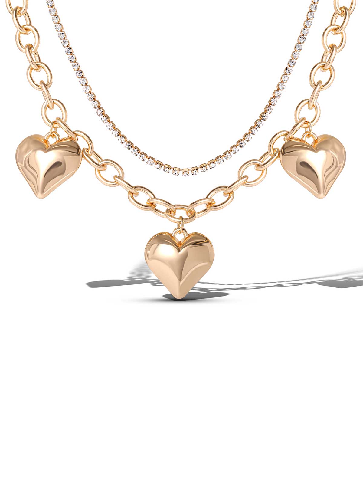 A statement-making gold necklace adorned with three large, shiny heart-shaped pendants for a bold look/p>