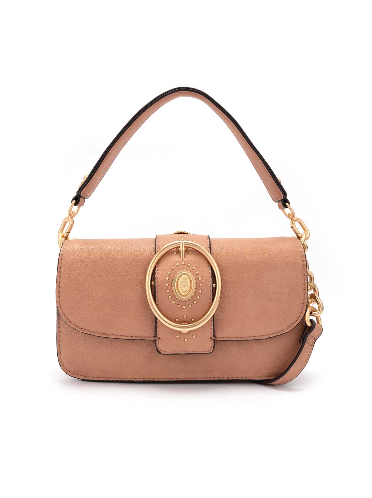 A compact shoulder bag with a structured flap design, accented by a bold central buckle and chain detailing. It features a short, wide strap with metal attachments and an optional chain for added edge and versatility.