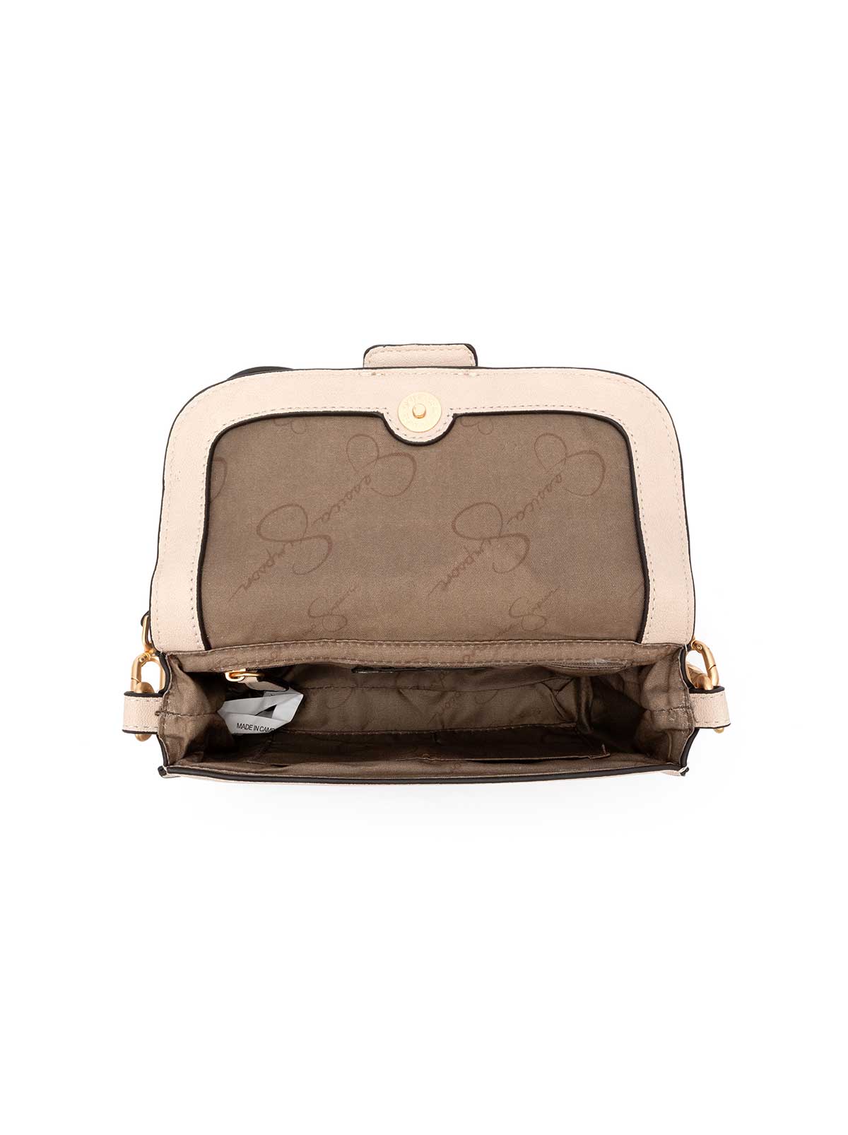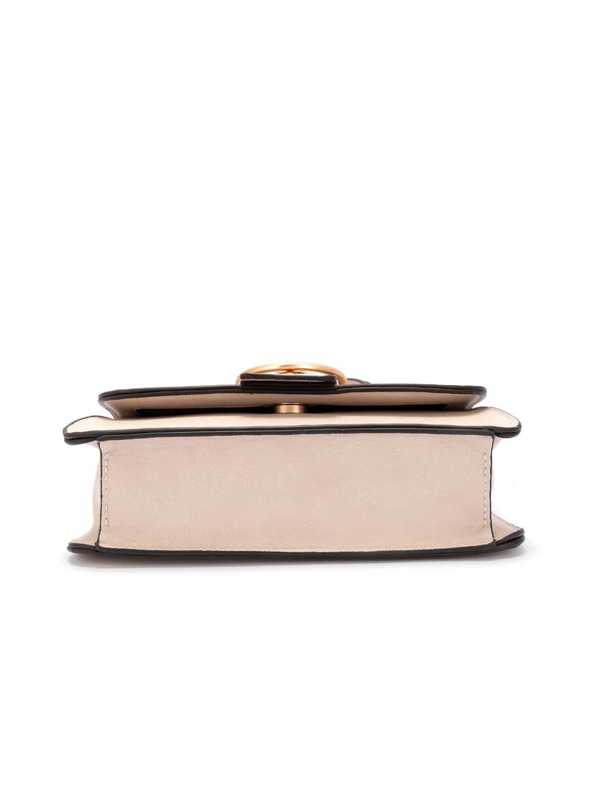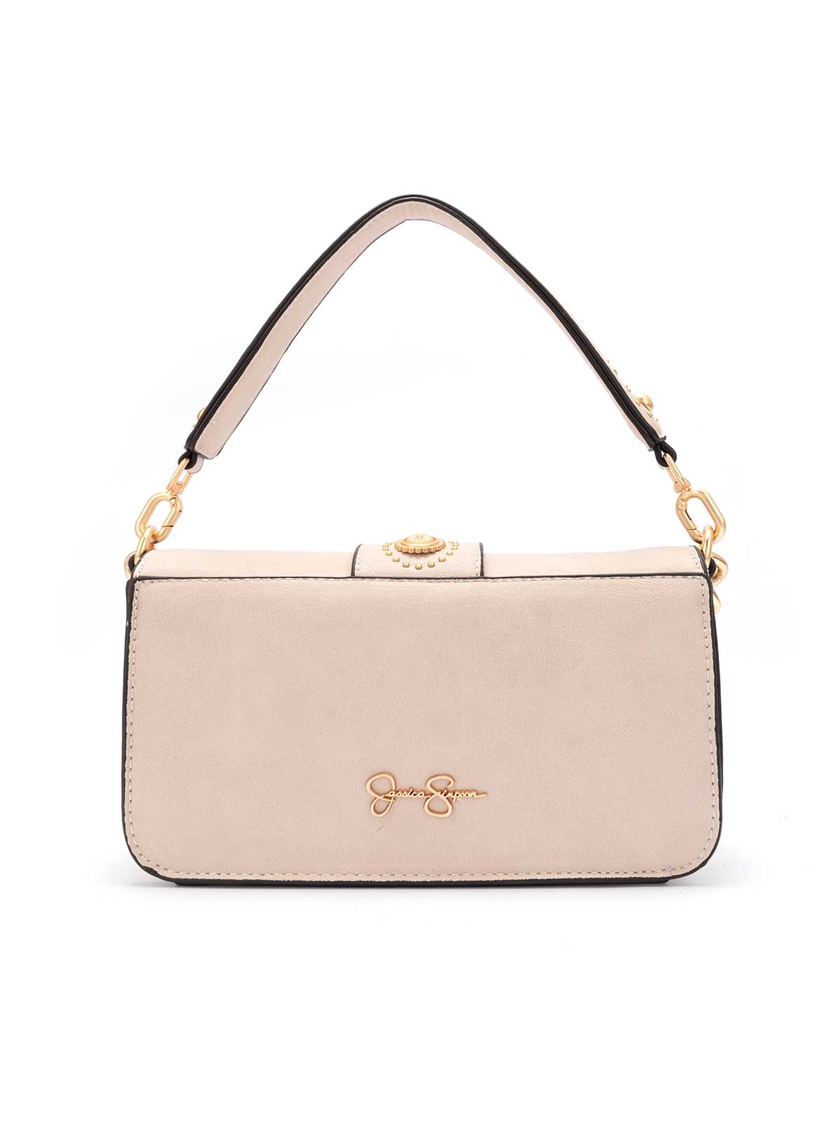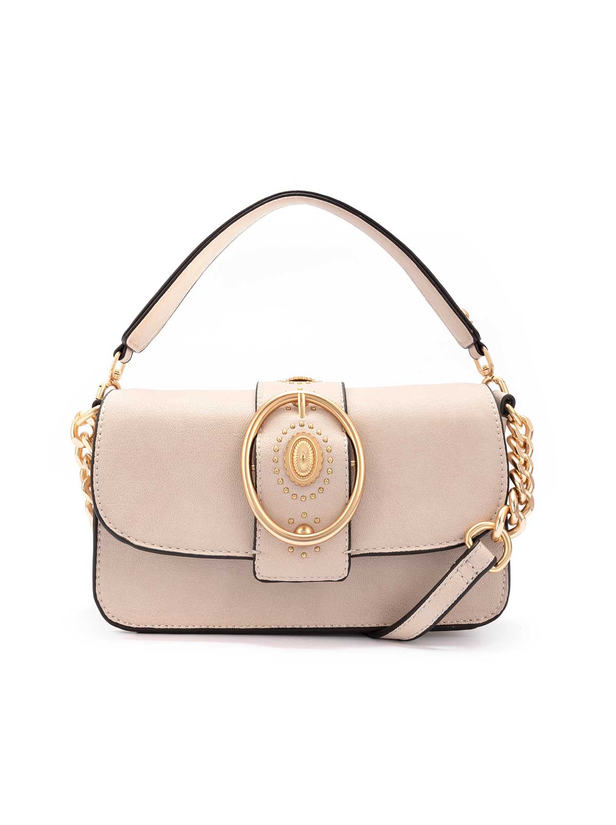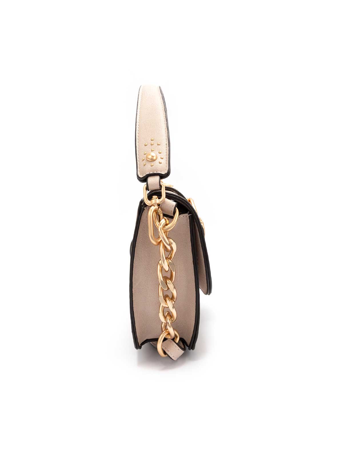 A compact shoulder bag with a structured flap design, accented by a bold central buckle and chain detailing. It features a short, wide strap with metal attachments and an optional chain for added edge and versatility.