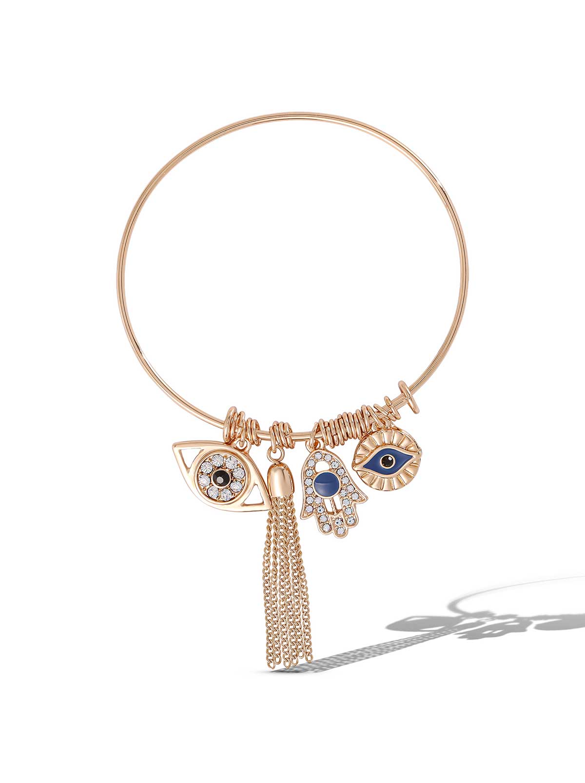 A beautifully designed gold bracelet featuring a sparkling, intricate pendant with blue and clear stones
