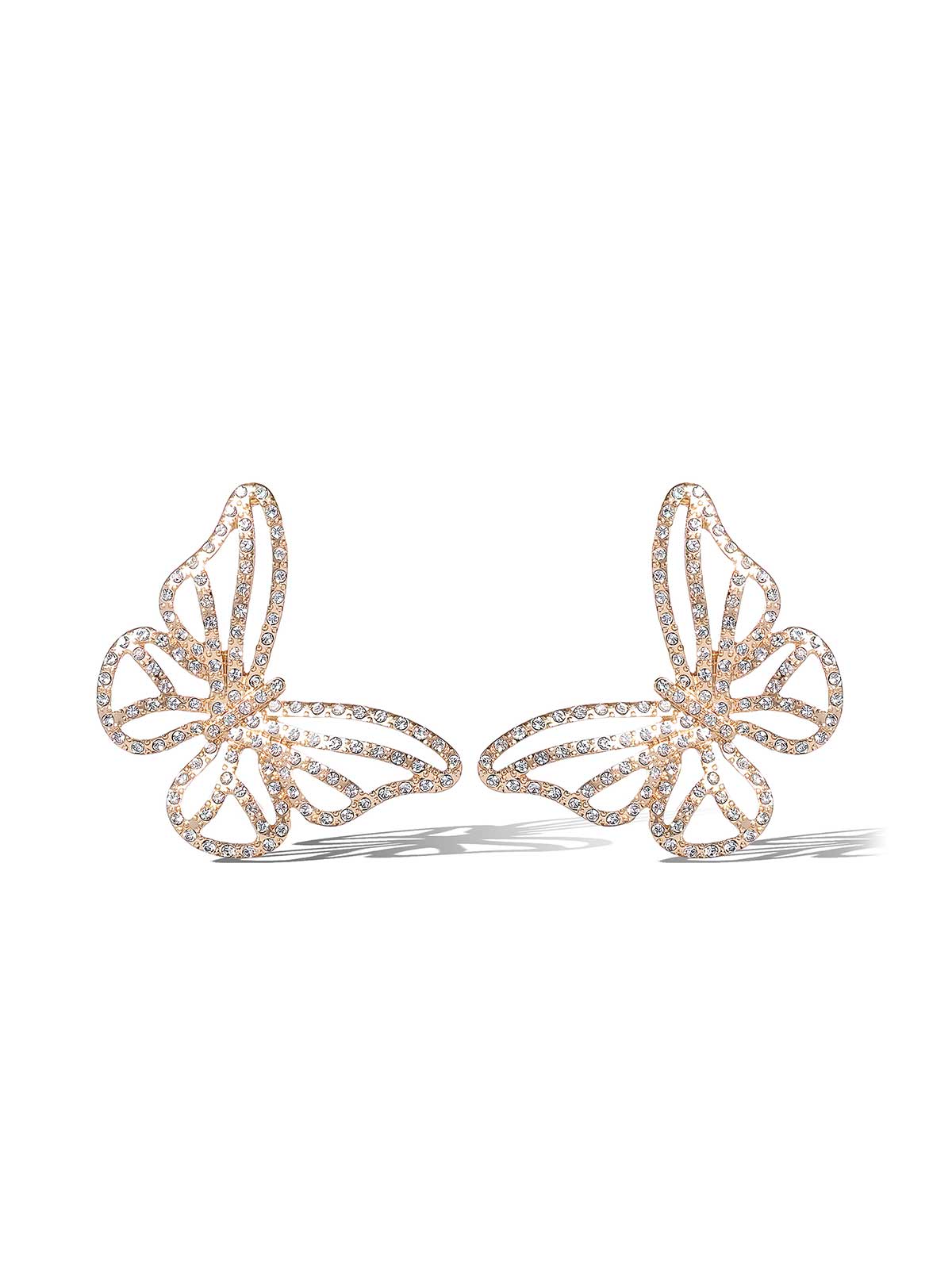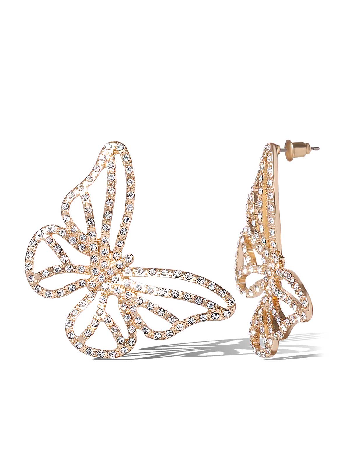 Take flight in style with these enchanting butterfly statement earrings, designed in an elegant openwork silhouette and encrusted with shimmering clear crystals. Set in a glowing gold-tone finish, these lightweight beauties make a magical impression—perfect for adding sparkle to any day or night look.