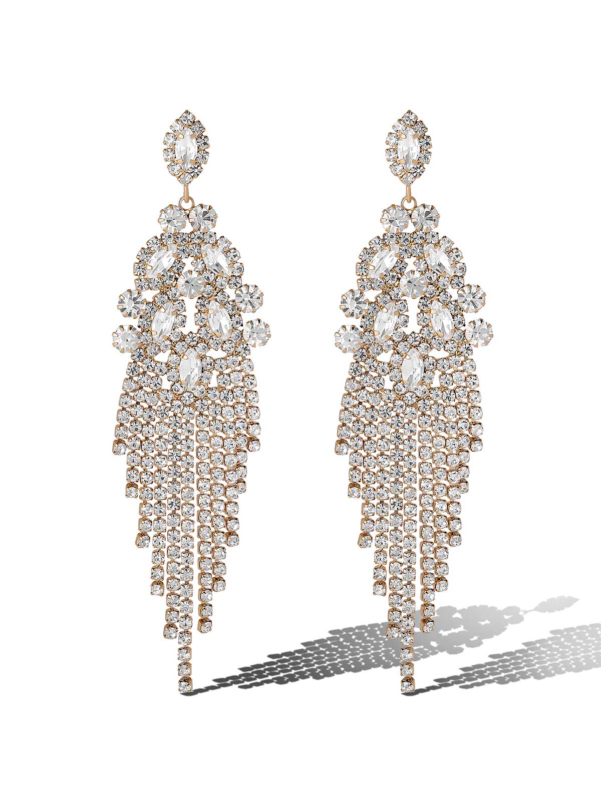 Steal the spotlight with these dazzling waterfall earrings, featuring a cascading array of brilliant clear crystals in marquise, round, and pavé settings. Set in a sleek gold-tone frame, these statement earrings exude red carpet elegance and shimmering movement—perfect for weddings, galas, and glamorous nights out.