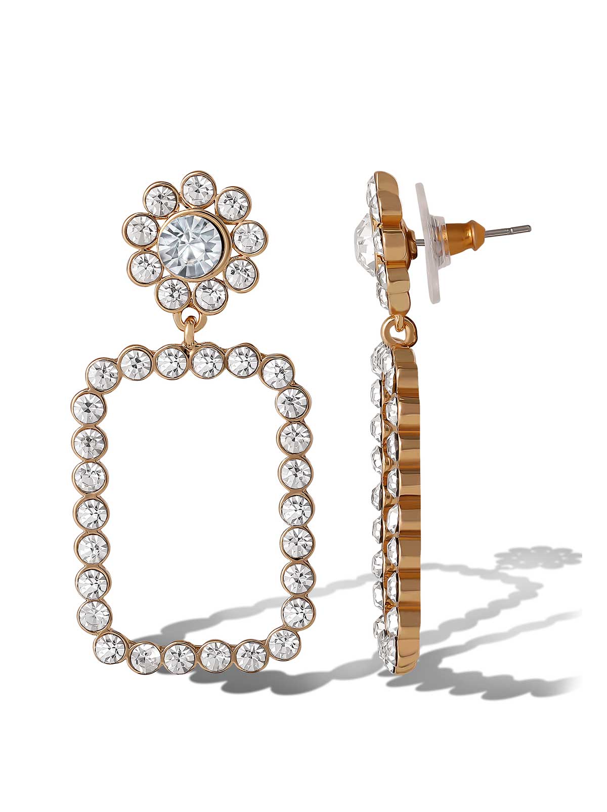 Turn heads with these dazzling daisy drop earrings, where floral elegance meets geometric glam. Featuring a crystal-studded daisy top and a bold open rectangle design, these earrings add the perfect sparkle to your evening look or festive outfit.