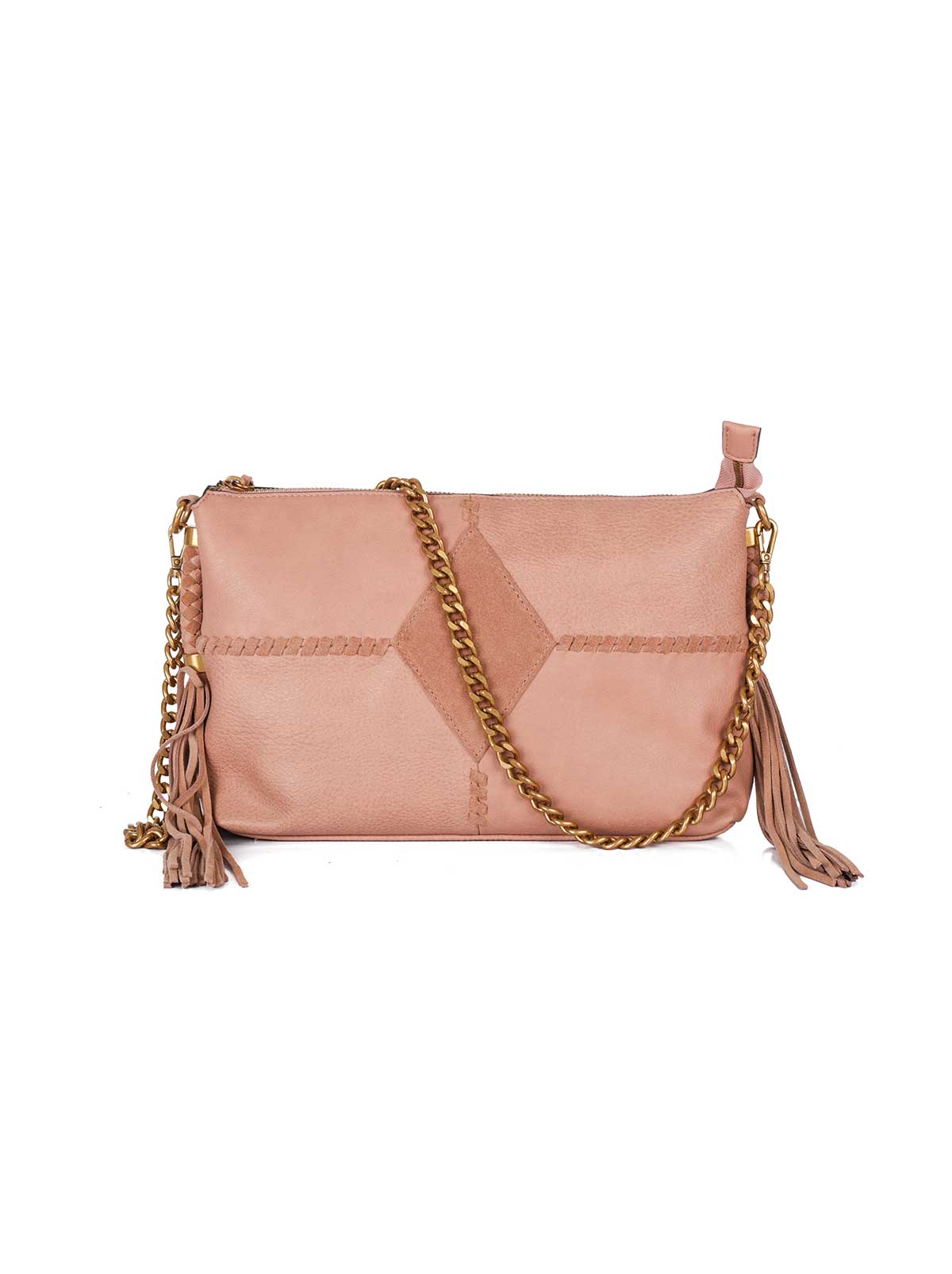 A rectangular crossbody bag featuring a central diamond-stitched design, braided detailing on the sides, and fringe tassels at each end. It has a zip-top closure and a single chain strap with a leather shoulder section for comfort. Stylish and versatile, ideal for day-to-night wear.