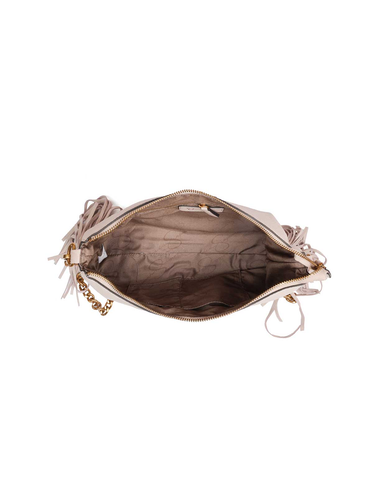 A rectangular crossbody bag featuring a central diamond-stitched design, braided detailing on the sides, and fringe tassels at each end. It has a zip-top closure and a single chain strap with a leather shoulder section for comfort. Stylish and versatile, ideal for day-to-night wear.