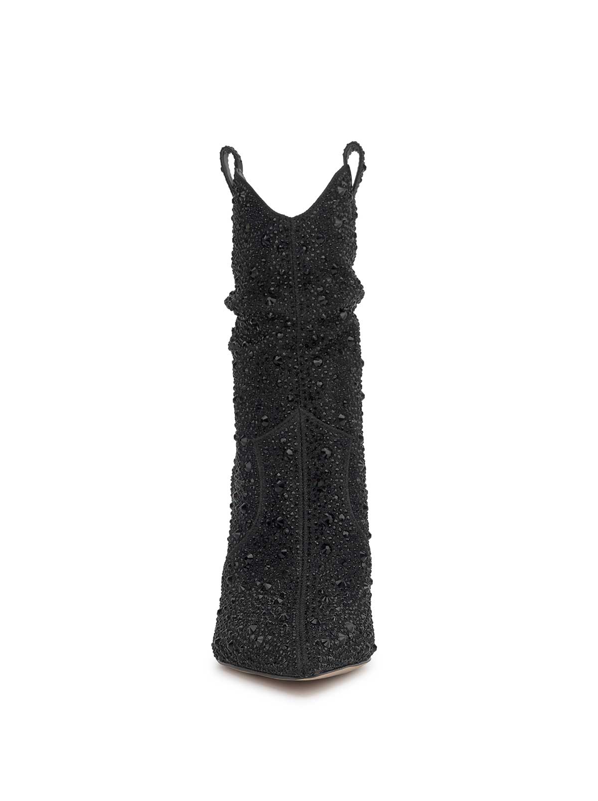 Turn heads with this glam-meets-Western ankle boot, designed to make a bold statement. Featuring a pointed toe and sleek stiletto heel, this boot blends cowgirl charm with high-fashion flair. Covered in sparkling rhinestone embellishments, the design catches the light with every step. Pull tabs and Western-inspired stitching complete the look, making it the perfect choice for concerts, parties, or adding standout style to your everyday wardrobe.