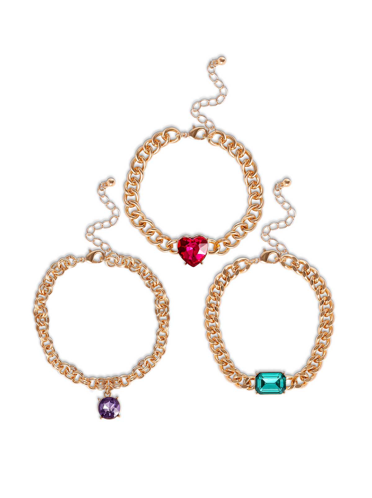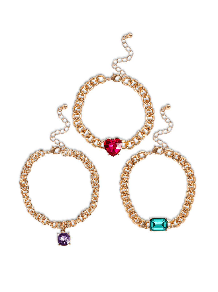 Add a pop of color and glam to your wrist stack with this dazzling set of three gold-tone chain bracelets, each featuring a bold, eye-catching gemstone charm. From the romantic red heart to the classic emerald-cut green and playful purple drop, these bracelets bring sparkle and personality to every outfit. Wear them together for a layered look or solo for a statement moment.