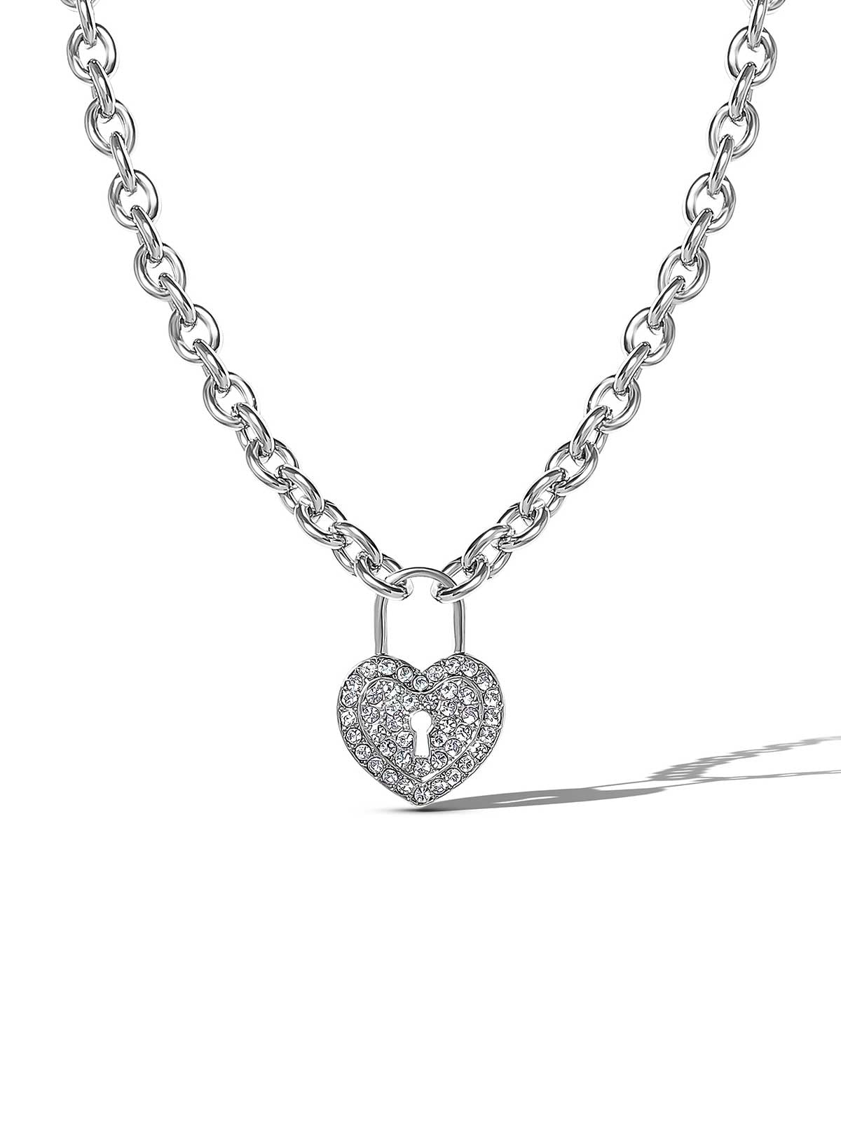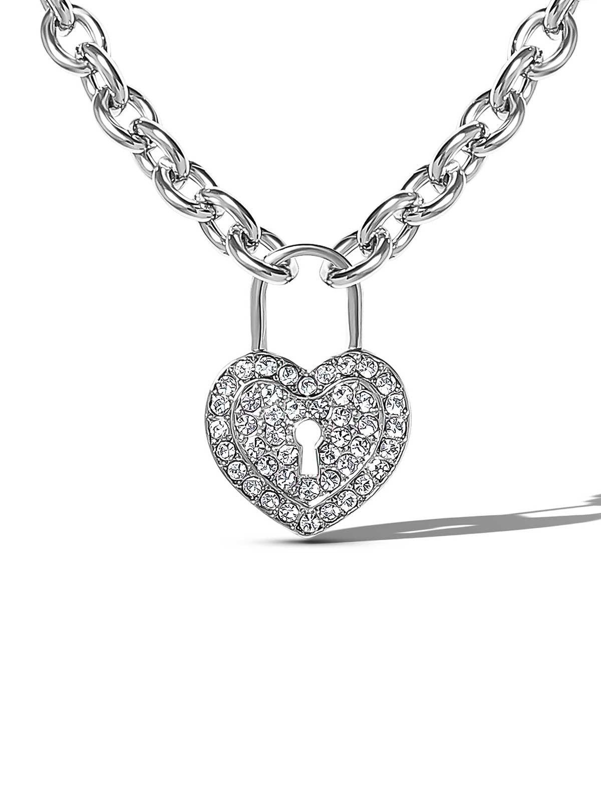 Unlock your style with this sparkling heart lock necklace, featuring a pavé crystal-encrusted charm on a chunky silver-tone chain. Equal parts edgy and sweet, this necklace is perfect for wearing solo as a bold statement of love, strength, and individuality.