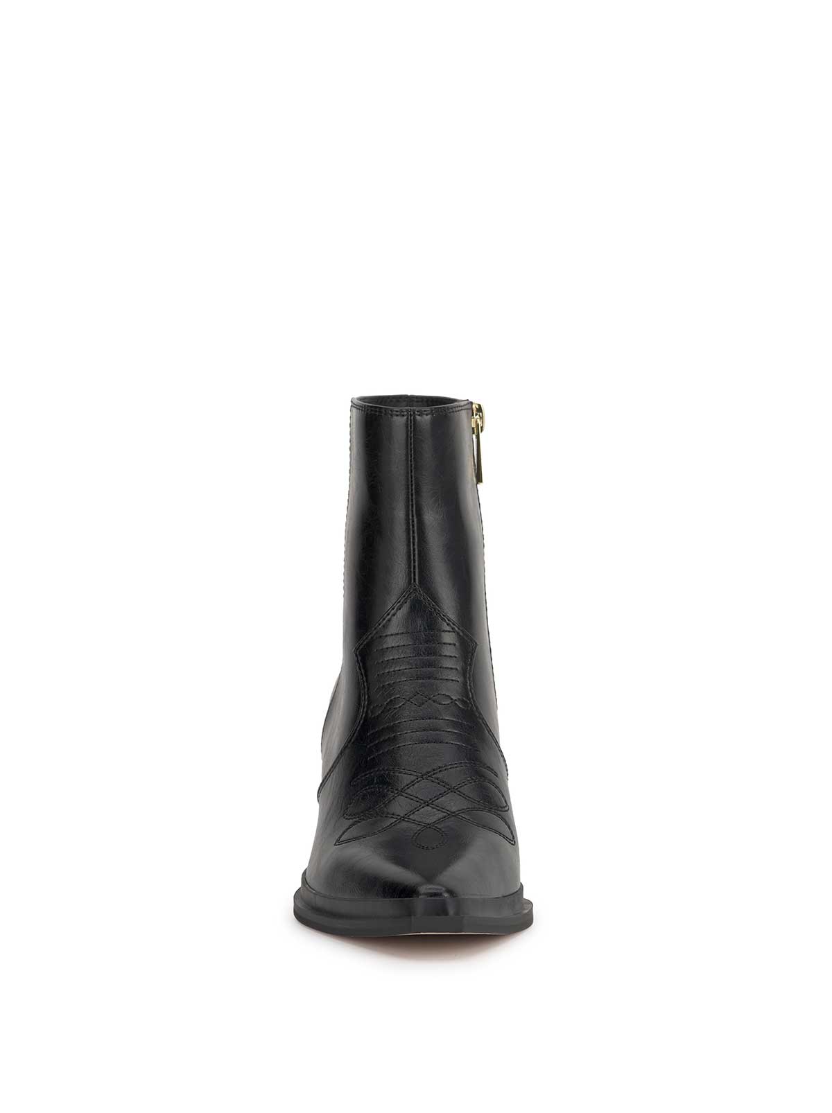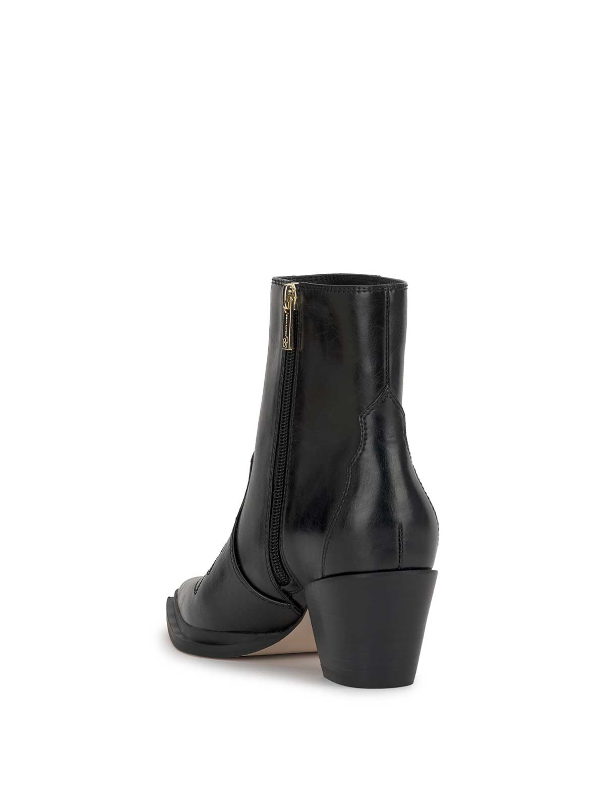 This ankle bootie has a pointed toe and a mid-height block heel. It features a sleek, Western-inspired design with minimal stitching details.
