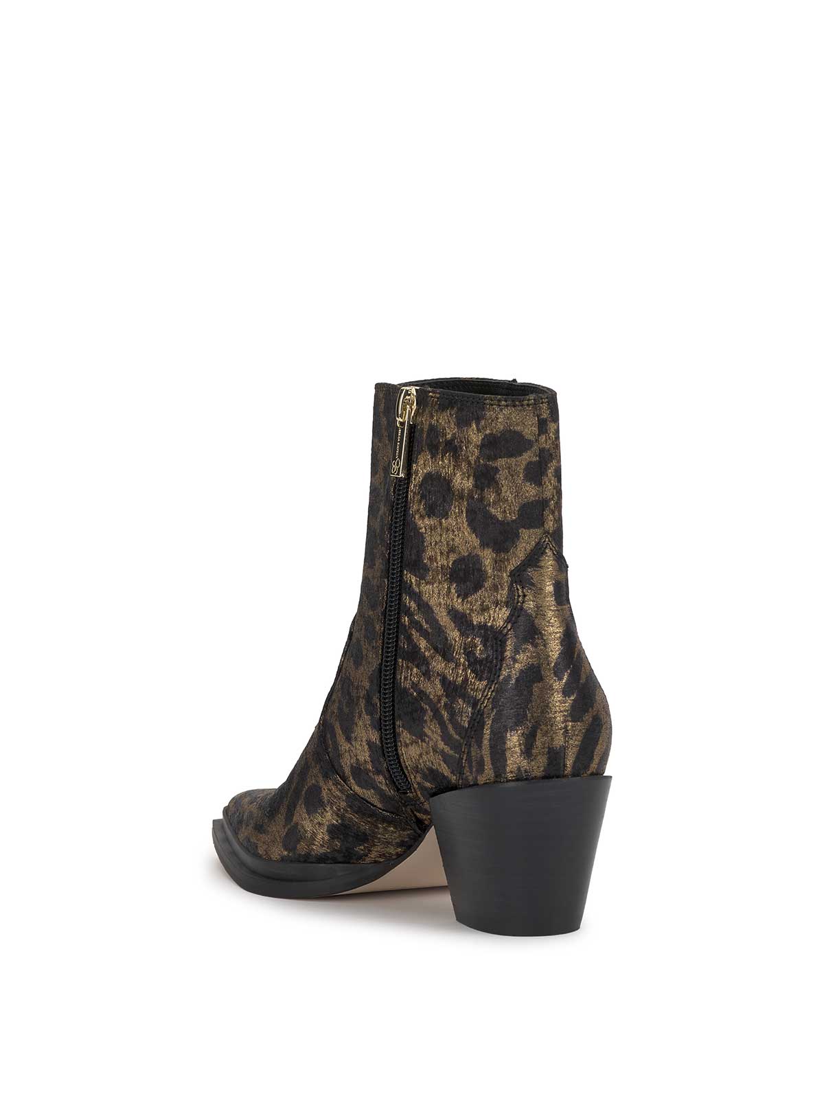 This ankle bootie has a pointed toe and a mid-height block heel. It features a sleek, Western-inspired design with minimal stitching details.