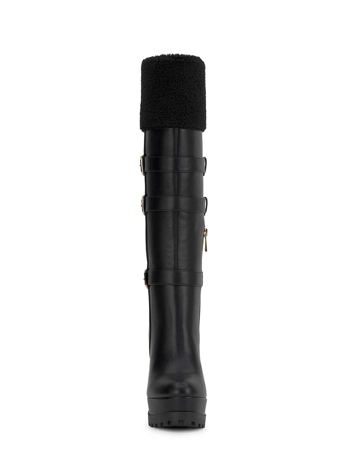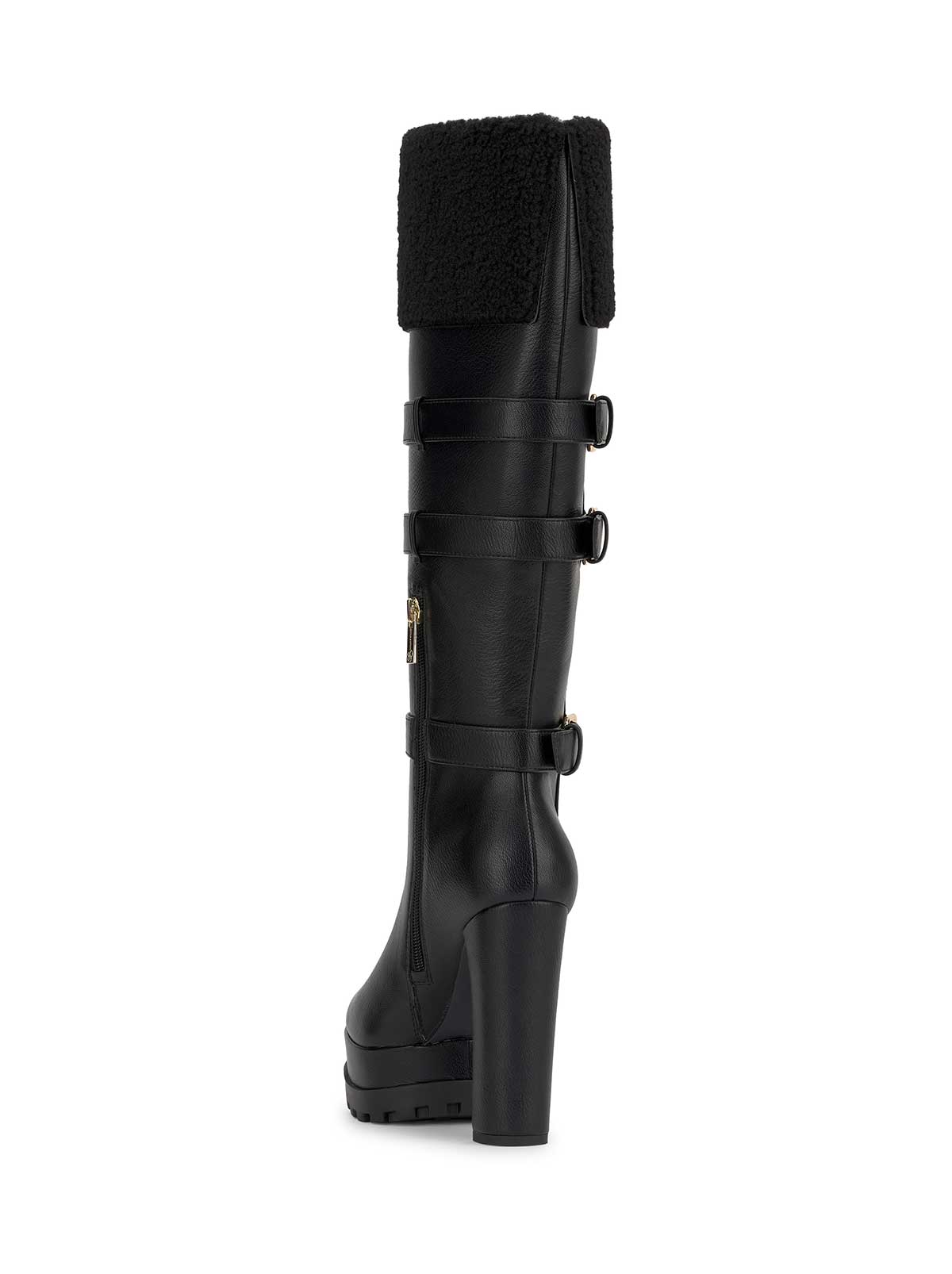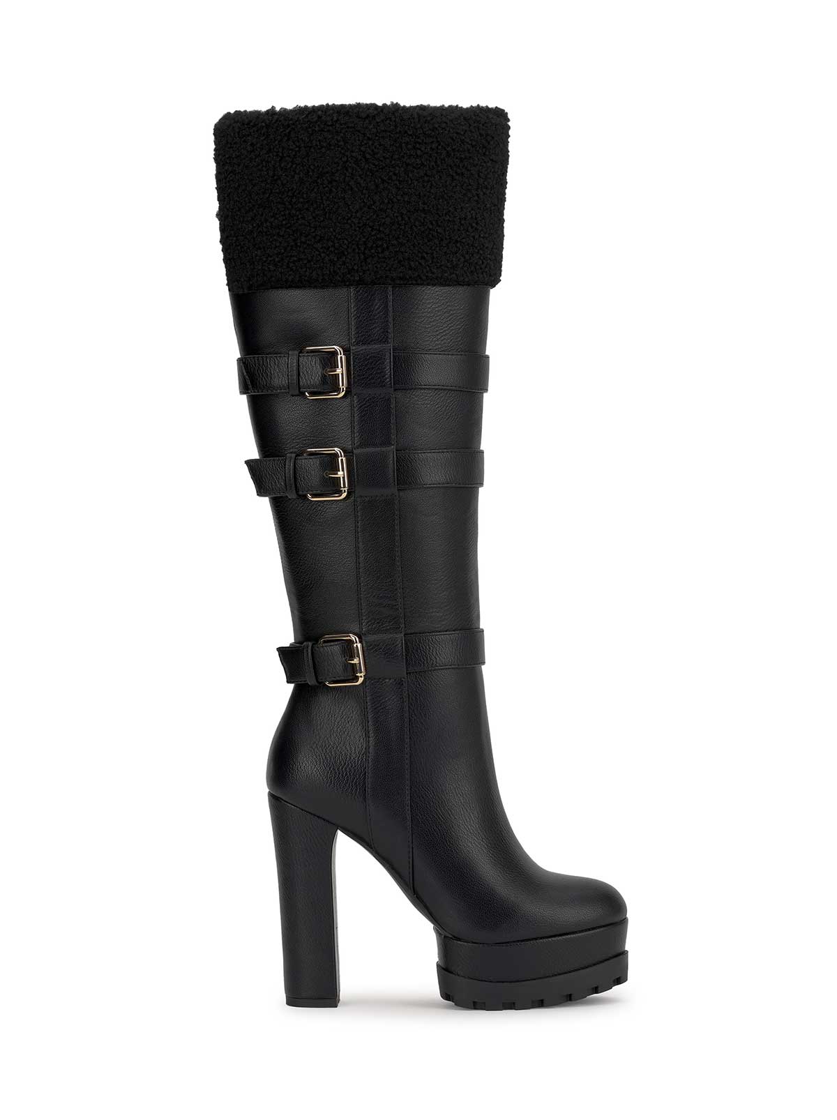 Tall shearling-trim boot with high block heel and platform sole. This knee-high style features a warm faux shearling cuff, three bold buckle straps along the shaft, and a rugged treaded outsole for grip. A fashion-forward blend of cozy and sleek—perfect for winter wear with an elevated edge.