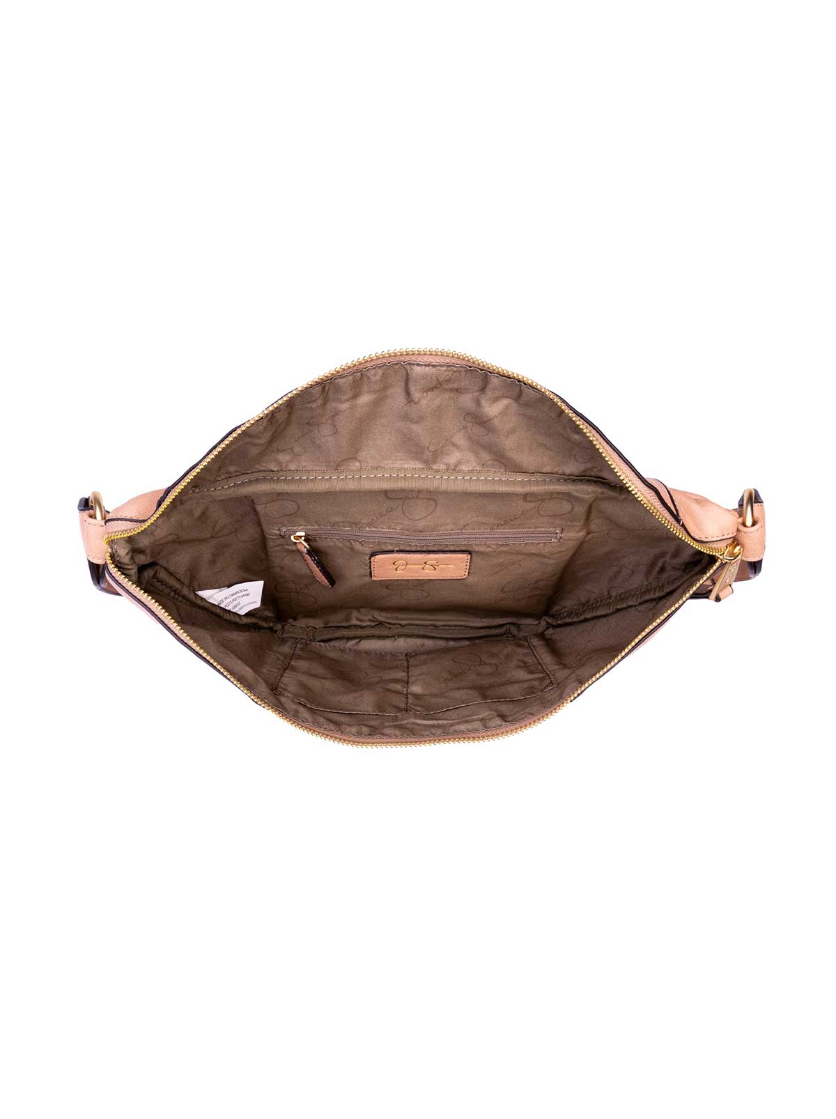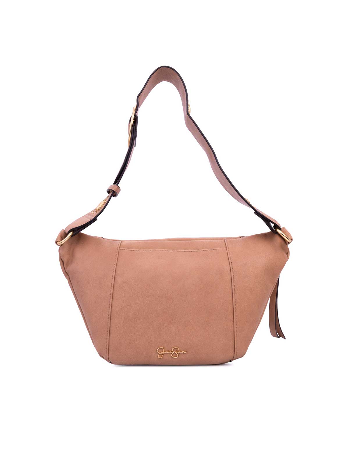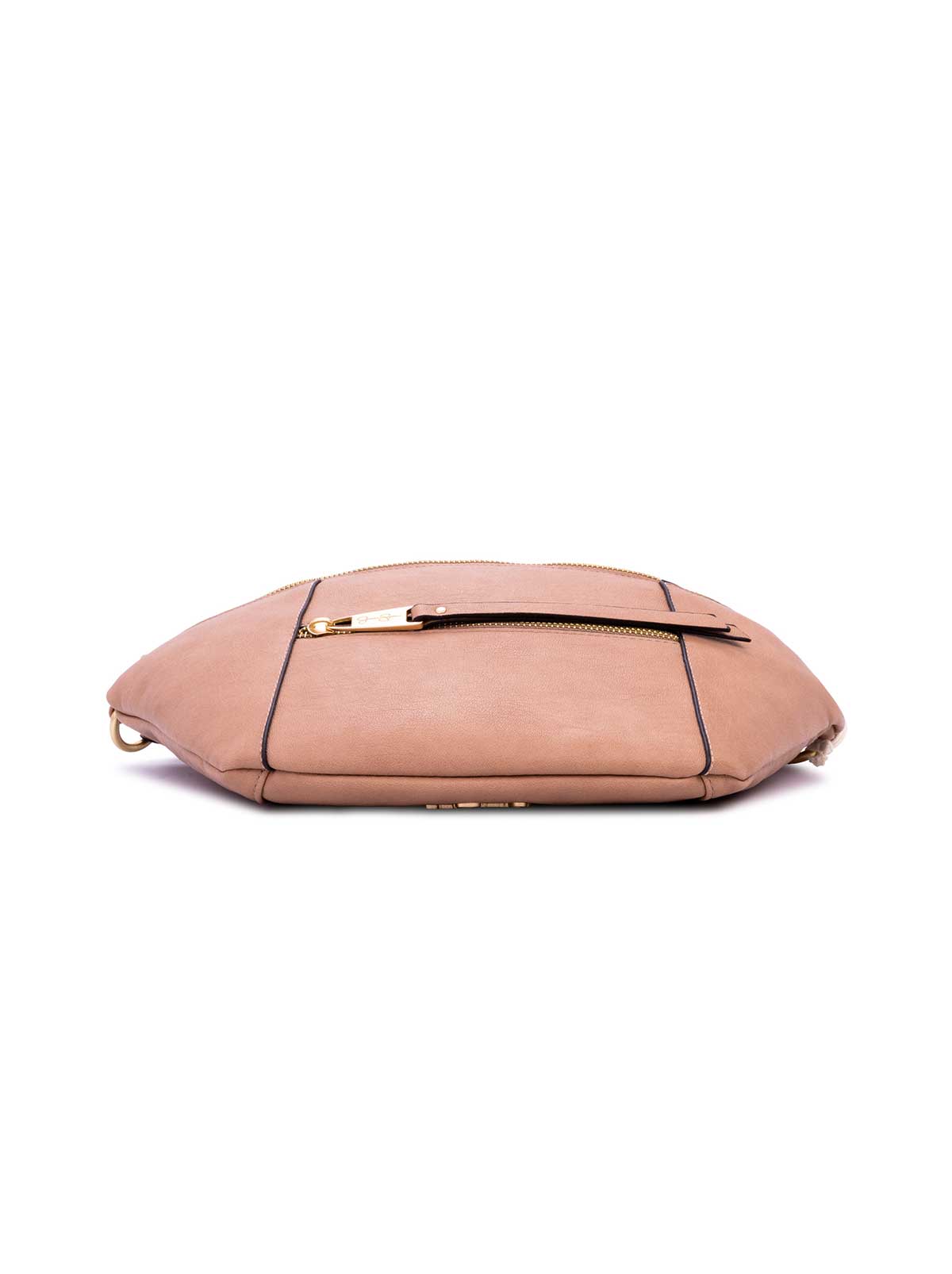 A sleek sling bag with a wide adjustable strap adorned with metallic studs. It features dual zippered compartments with long tassel pulls, offering a sporty and functional design for hands-free everyday wear.