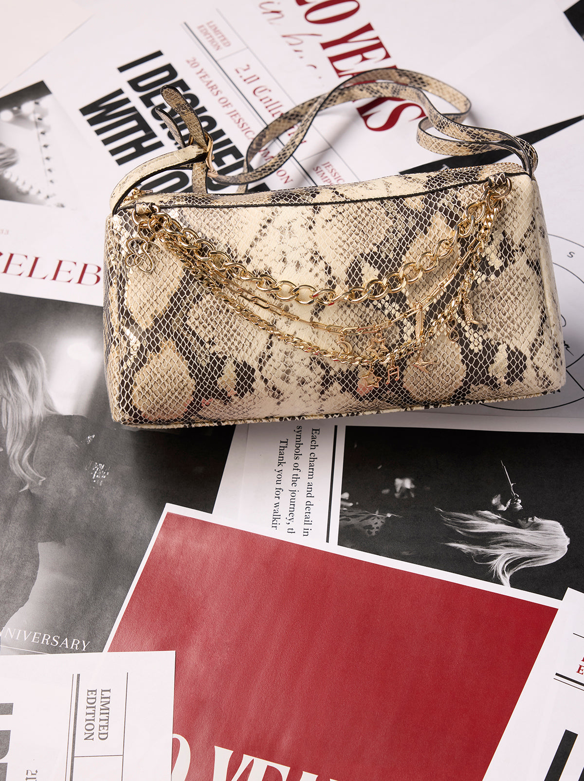 This handbag is a little rectangle of sass—flap front, sturdy top handle, and swishy chain straps you can clip on or off. Its snakeskin-style texture says “I’m wild,” while the shiny metal hardware says “but I’ve got class.”