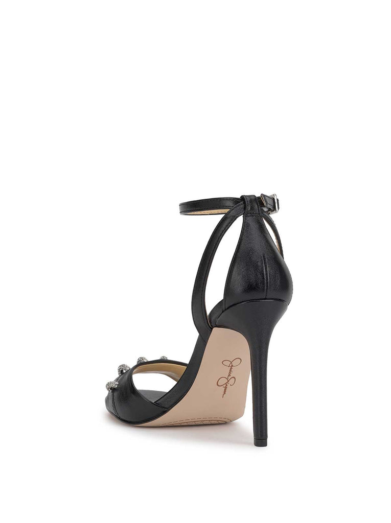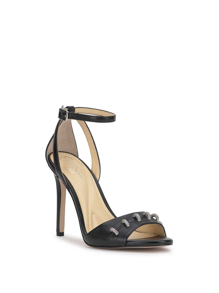 Looking for that one shoe that does it all? Found it. This stiletto brings the glam without even trying. Sleek satin finish? Check. Delicate ankle strap? Check. Sparkly rhinestone loops across the toe strap? Big, glittery check.