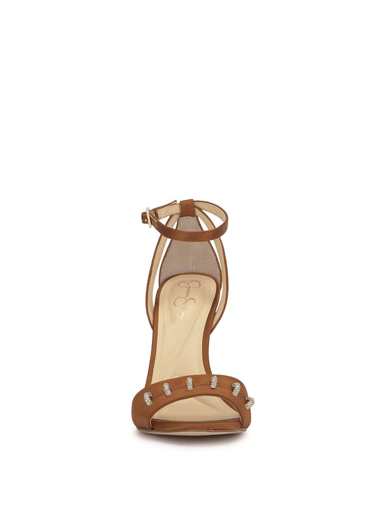 Looking for that one shoe that does it all? Found it. This stiletto brings the glam without even trying. Sleek satin finish? Check. Delicate ankle strap? Check. Sparkly rhinestone loops across the toe strap? Big, glittery check.