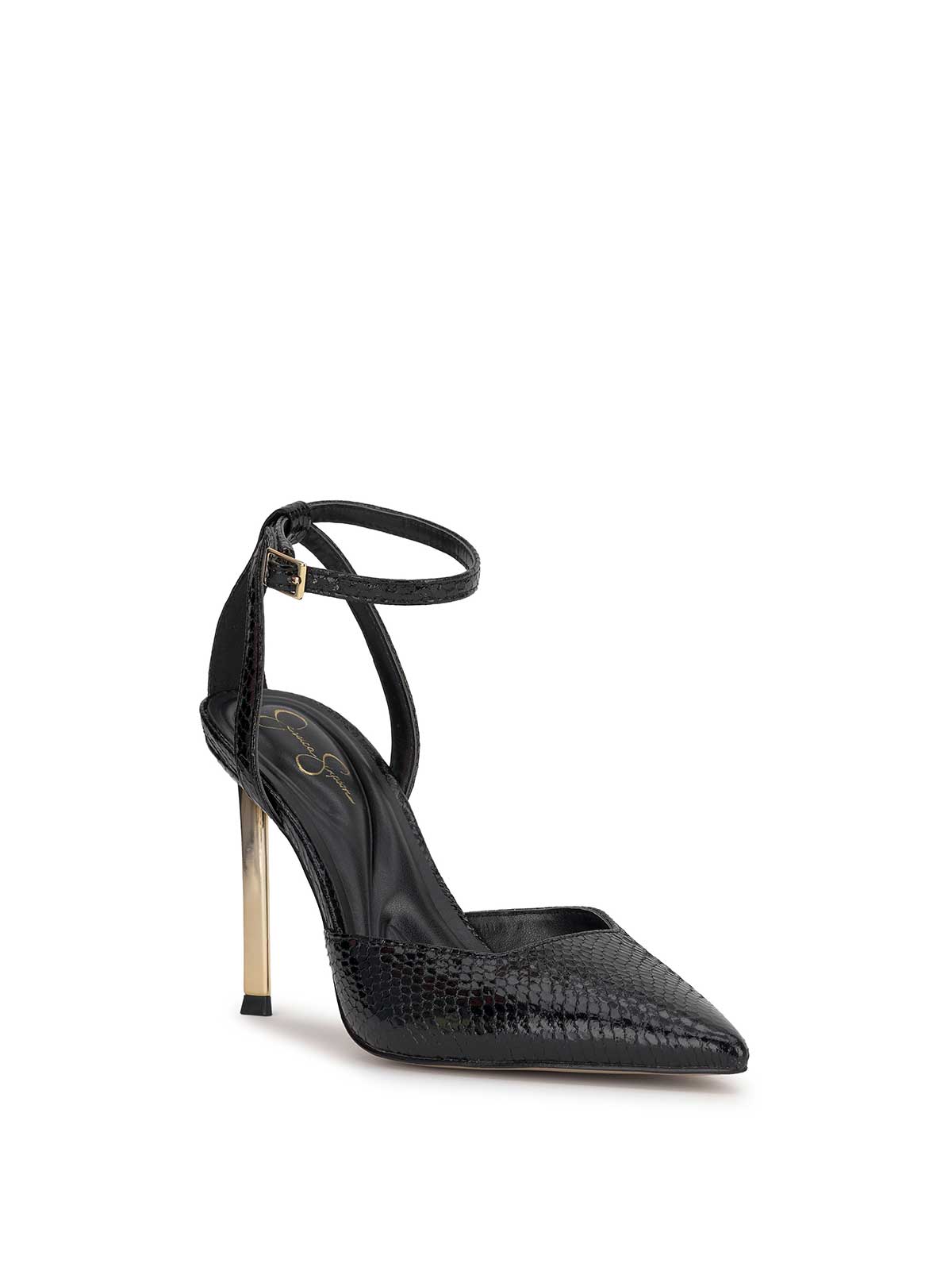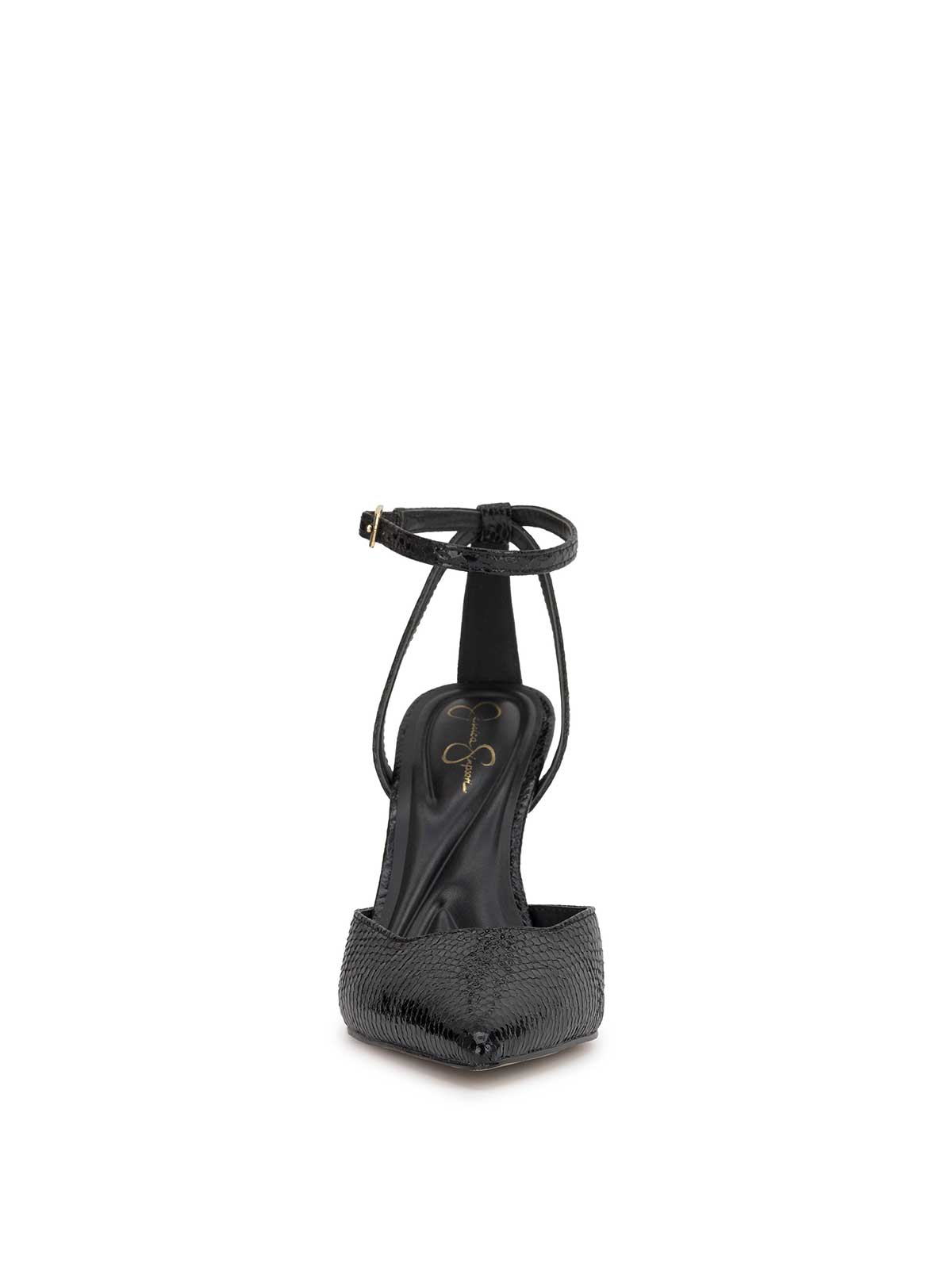 Elegant pointed-toe pump with refined ankle strap. Featuring a sleek stiletto heel and a textured finish, this sophisticated silhouette exudes modern polish. The delicate ankle strap and d’Orsay cutout add graceful balance, making it a timeless choice for evening elegance or elevated daywear.