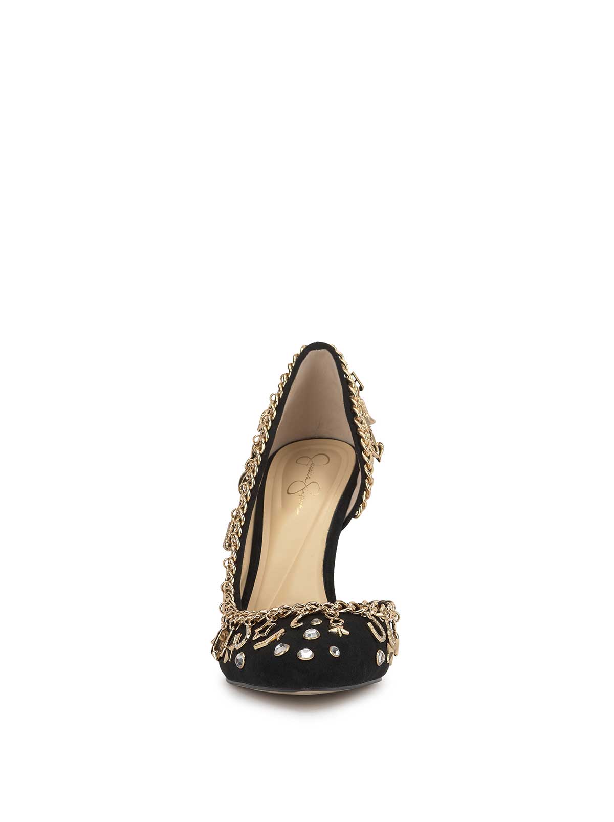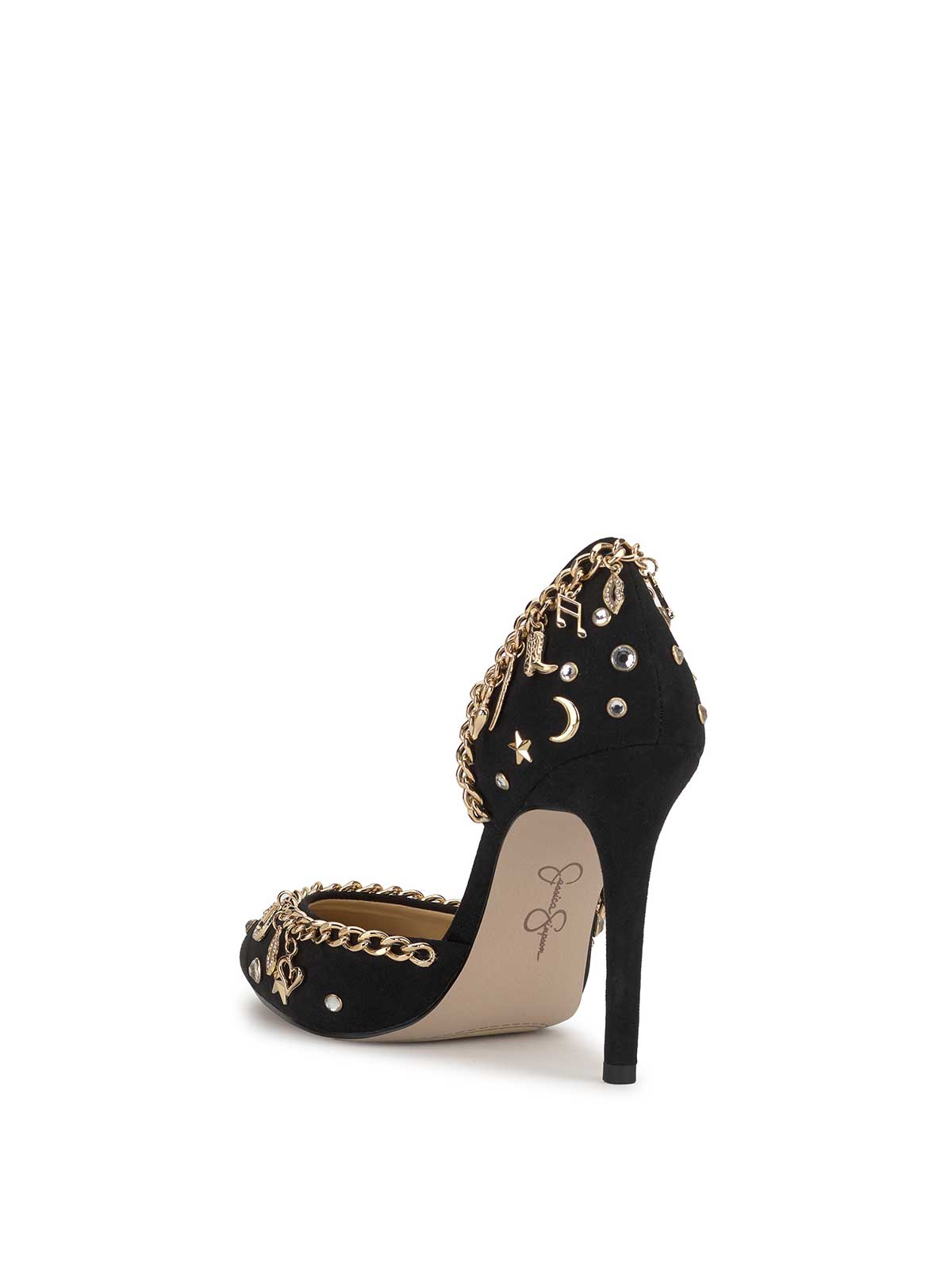 Unleash your inner star with this captivating high-heel pump, designed to dazzle from every angle. This statement shoe features a sleek pointed toe and a slender stiletto heel that adds striking height and elegance. The upper is adorned with shimmering embellishments, sparkling stones, and playful metallic charms, all linked by an eye-catching chain detail that drapes gracefully around the edges. Perfect for evenings out, special events, or anytime you want your footwear to steal the show, this pump is a true celebration of glamour and individuality.