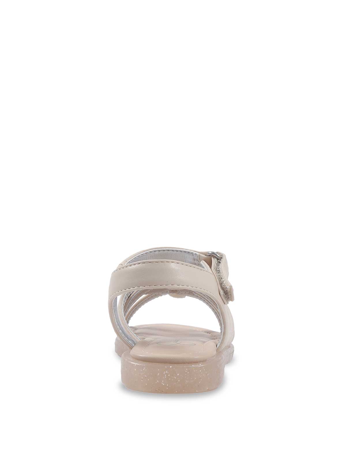 This toddler girl's sandal features a strappy design in cream with floral embellishments on the front straps, each accented with a sparkling center. The sandal has an adjustable hook-and-loop ankle strap for a secure fit and a glitter-infused sole for a fun, sparkly touch. It’s a cute and comfortable choice for warm-weather outings.